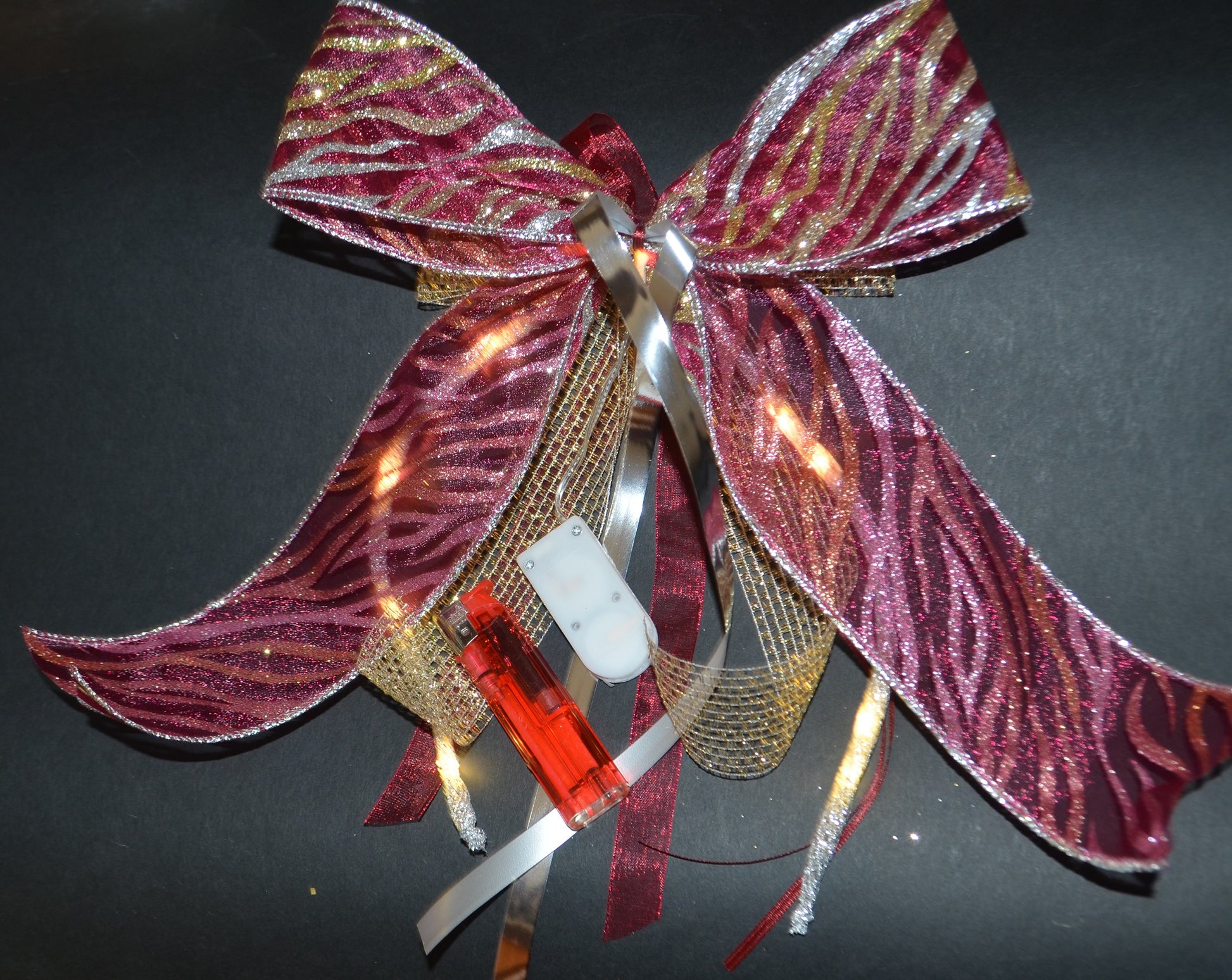 Yderligere dekoration et guldnetbånd og en organzasløjfe, satinbånd i mørkerød. LED-lysene er pakket ind i et sølvfarvet gitterbånd.