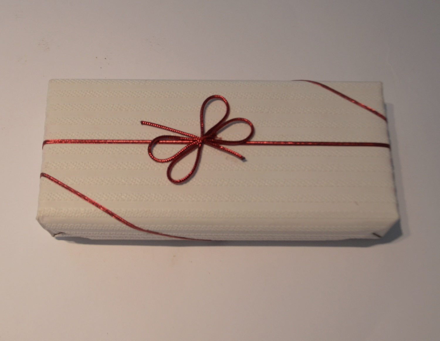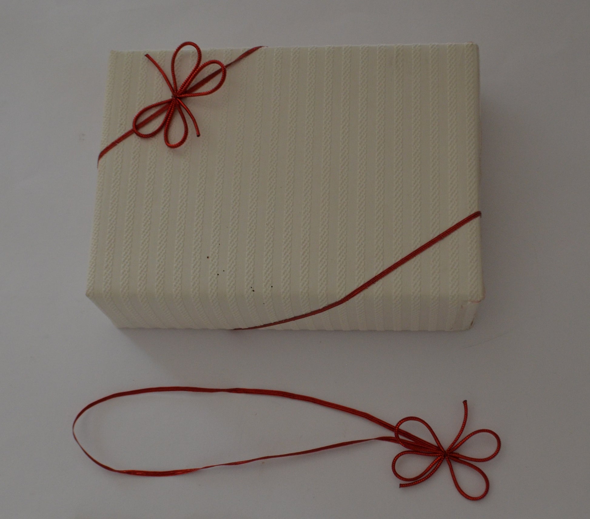 The bow, with a round elastic loop attachment can easily be applied to a box, bottle, a jar or a tin.