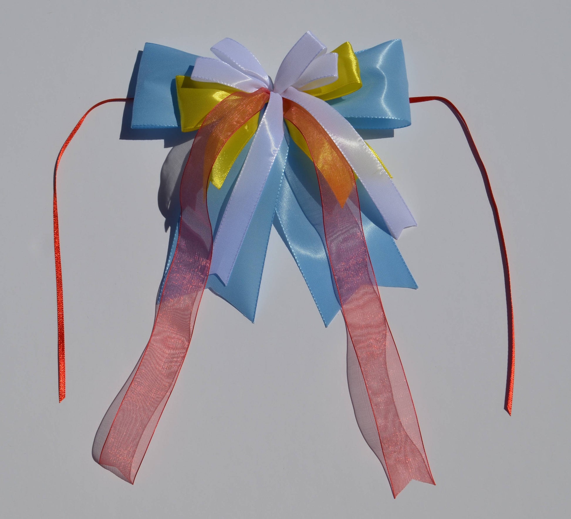 The main bow is made of 60mm (2.4 inch) wide taffeta ribbon measures 16x18cm (6.2x7 inch).